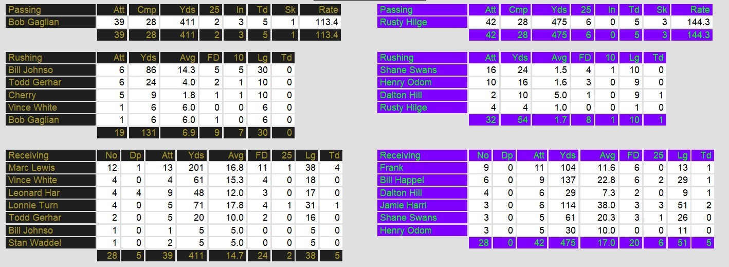 With only seconds left, the Gold could muster no miracle to pull out the game and ended in defeat. In a losing effort, Bob Gagliano also threw five touchdowns. However, he also threw 3 interceptions, including the costly one after the go ahead touchdown.