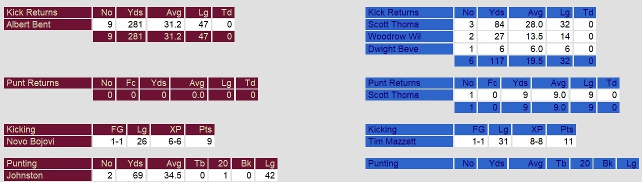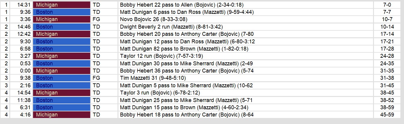 Michigan closed to within a touchdown early in the 4th quarter. However, Boston got 2 of Matt Dunigan’s 7 touchdowns in that quarter to extend the lead and ultimately win the game. The true difference in the game, though, was Boston’s ability to run. They outgained the Panthers 199-82 on the ground.