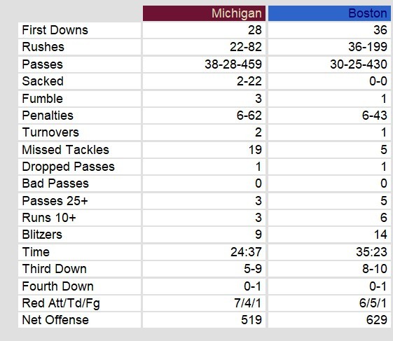 Michigan closed to within a touchdown early in the 4th quarter. However, Boston got 2 of Matt Dunigan’s 7 touchdowns in that quarter to extend the lead and ultimately win the game. The true difference in the game, though, was Boston’s ability to run. They outgained the Panthers 199-82 on the ground.