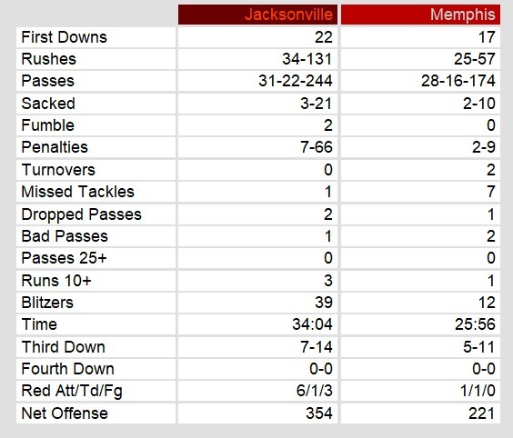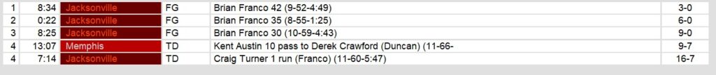 Memphis managed only 221 total yards, including 57 on the ground. Their only score came from a late Kent Austin touchdown pass. It put the game at 9-7 and gave them a chance. However, Jacksonville running back Craig Turner scored another touchdown to put the game away.