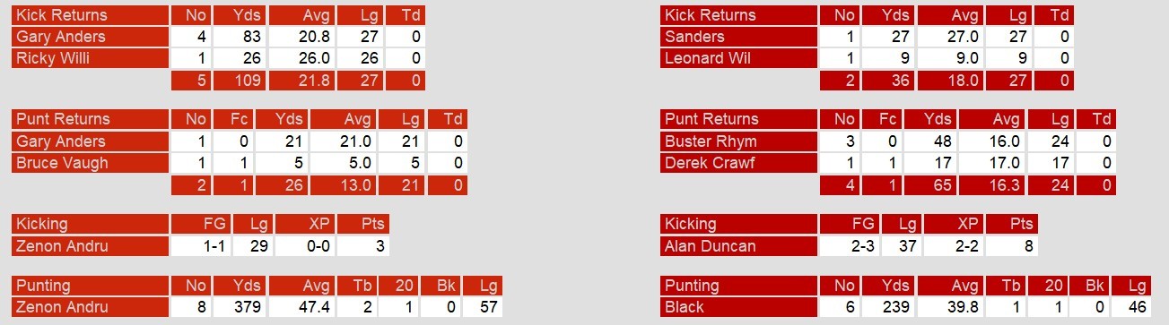 Meanwhile, as Memphis quarterback Kent Austin struggled as well, running back Thomas Sanders picked up the slack. He ran for 70 yards and a touchdown. He also caught a six yard touchdown pass. Two field goals closed out the Showboats scoring.