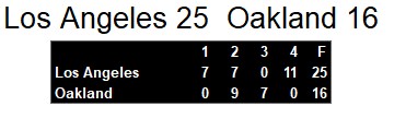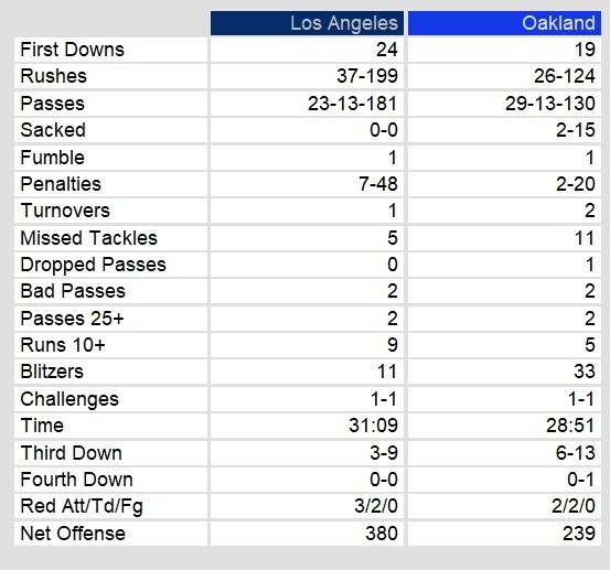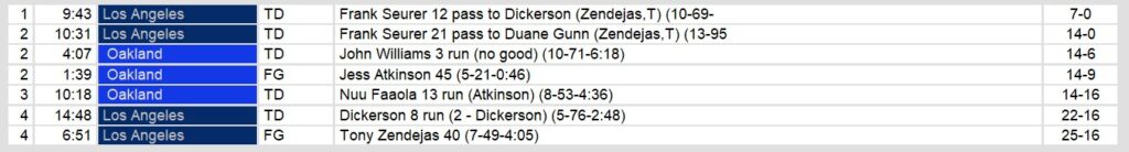 Oakland played well, but they couldn’t keep with Dickerson’s domination. He rushed for 186 of LA’s 199 rushing yards in the game. Oakland also scored two rushing touchdowns, but their leading rushers managed only 54 and 53 yards between them. Quarterback Fred Besana also struggled, throwing 2 interceptions in the game.