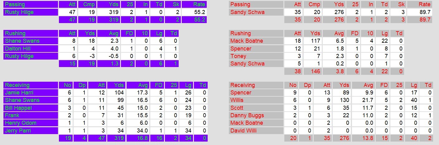 New Orleans quarterback Rusty Hilger couldn’t make up for the lack of a run game. He completed only 19 passes on 47 attempts for 319 yards. Both facets of the offense contributed to the Brass holding the ball for only 22 mintues in the game.