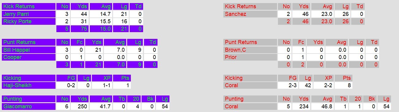 New Orleans quarterback Rusty Hilger couldn’t make up for the lack of a run game. He completed only 19 passes on 47 attempts for 319 yards. Both facets of the offense contributed to the Brass holding the ball for only 22 mintues in the game.