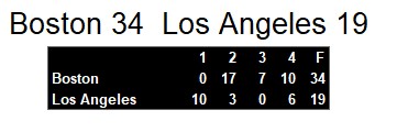 Both teams are on the road next week. Boston in New Orleands and Los Angeles in Pittsburgh.