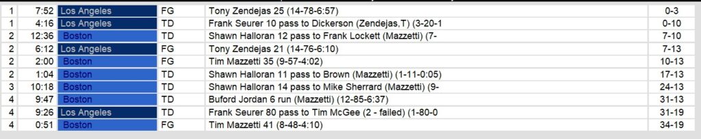 Los Angeles scored again to bring the score within 12. But, the Boston defense held for the remaining 9 minutes of the game, ending LA’s final possessions with interceptions. Los Angeles gained more yards than Boston, but the Breakers kept Eric Dickerson to under 30 yards in the game.