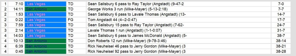 Dateline: Friday, May 23, 1986. Las Vegas got back into the win column with an impressive win against San Antonio Friday Night. After trading touchdowns, Vegas went on a 31-0 run and led 38-7 at the beginning of the fourth quarter. Backup quarterback Sean Salisury finally showed some life to bring the Ace to the postseason in only their second year.