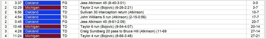Dateline: Sunday, June 8, 1986. Michigan makes the playoffs in spite of a late season 2 game swoon against San Antonio and Oakland. They have the three spot and will host Okalhoma in the wild card round. After a hot start with rookie quarterback Jim Harbaugh, they rested the young man for the end of the season out of precaution. They hope to see him back in the saddle next week.