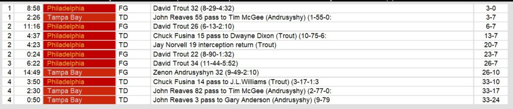 Inspite of those 5 interceptions (and two fumbles), Tampa stayed within striking distance for most of the game. They ran out of time, scoring one last toucdhown with only 30 seconds left in the game. The game may have been John Reeves’ last. He is 36 years old and Tampa wants to see what they have in their young current back up, Frank Reich.