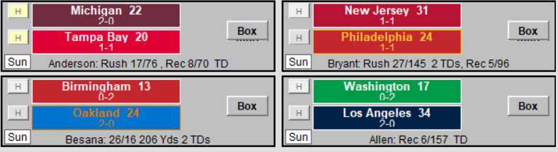 Neither MVP race provided much drama this year. Both winners ran (literally in the case of the offense) with the award. The defensive winner led an undefeated team in the regular season. They lost a heartbreaker in the playoffs to Chicago, but they won every game in the regular season. He made 110 tackles, 13 hurries, 7 stuffs, 7 forced fumbles, 1 pass defended, and 1 interception. He also set a standard for sacks that probably won’t soon be eclipsed. Michigan Panther OLB John Corker terrorized opposing quarterbacks to the tune of 27 sacks or 1.5 per game. He recorded 3 in a game 4 times. That alone won him the award.
