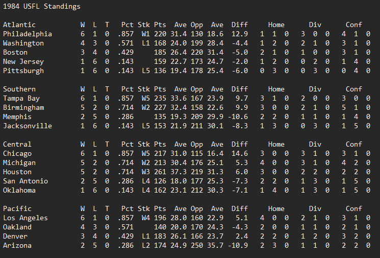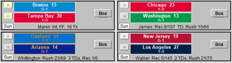 The top of the divisions look pretty much the same after week 9’s results. Some teams have started to shuffle into the 3rd place playoff position in each division, including perennial powers Philadelphia, Tampa, and Oakland and newcomer Oklahoma.