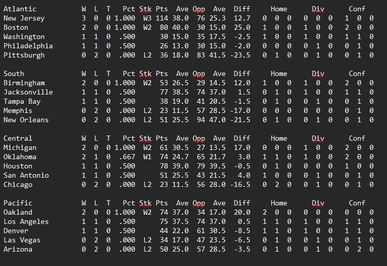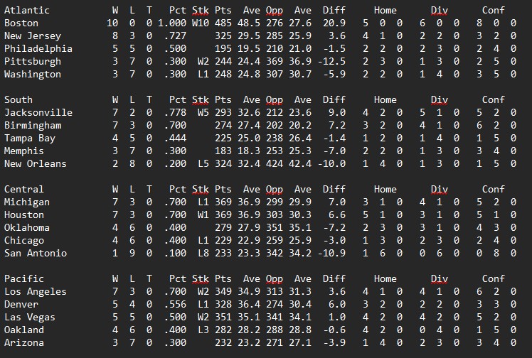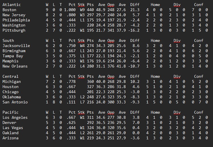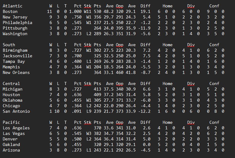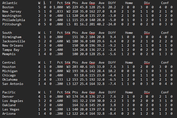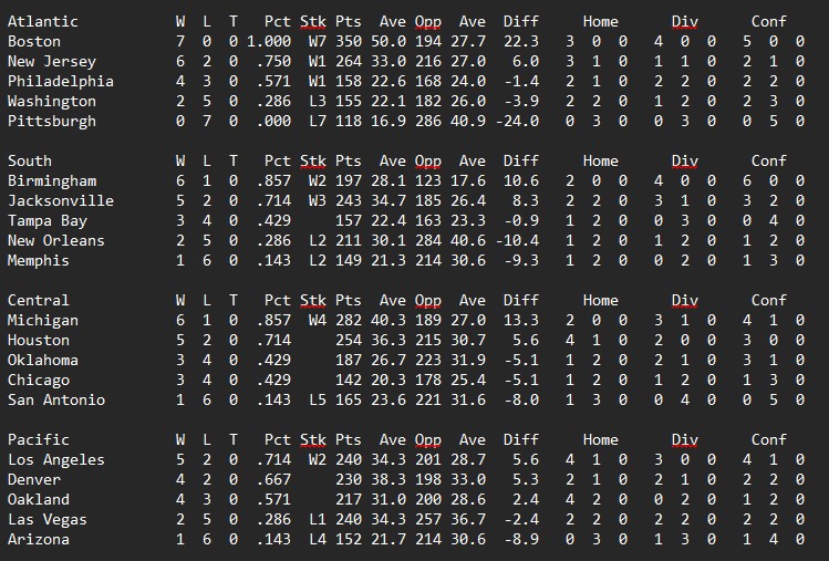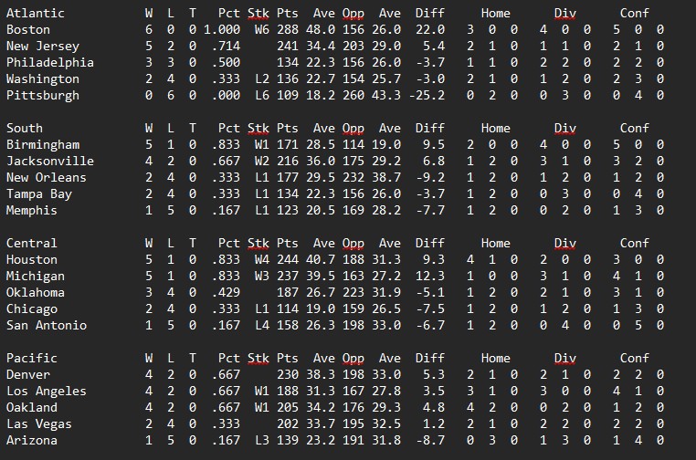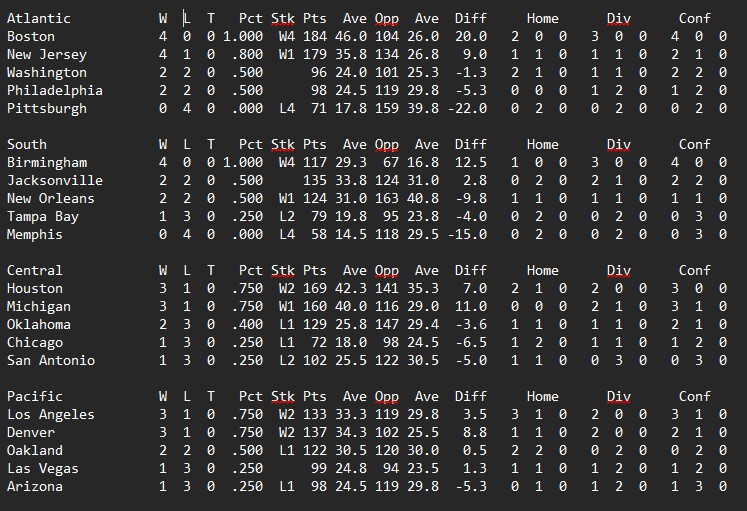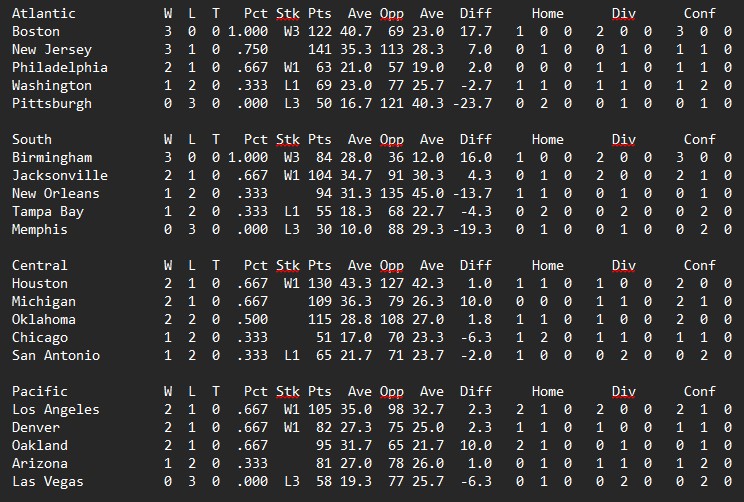 Philadelphia pulled off a bit of a shocker in Houston, New Orleans slowed Denver down just enough to outscore them. Michigan and New Jersey took care of business while Birmingham came out on top in perhaps the game of the week against Los Angeles.
