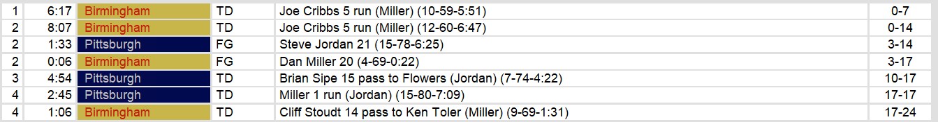 Birmingham struck first in the second quarter with Cliff Stoudt connecting on a 41-yard touchdown pass to Jim Smith. Stoudt followed up with a methodical drive just before halftime, capped by a Joel Coles 4-yard touchdown run, giving Birmingham a 14-0 lead at the break. The Generals responded early in the third quarter when Herschel Walker broke free for a 12-yard touchdown, and Roger Ruzek’s 38-yard field goal soon after narrowed the gap to 14-10. However, the Stallions delivered a decisive blow late in the third quarter, as Stoudt again found Smith in the end zone, this time from 8 yards out, to extend the lead to 21-10.