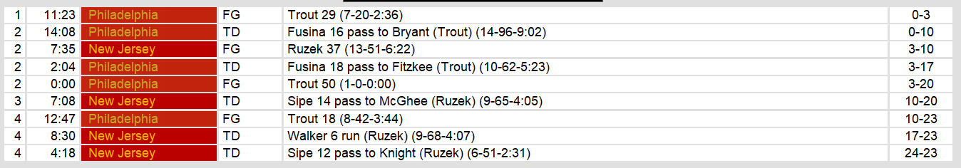 The Sunday games featured closer games. New Jersey ran into the buzz saw that are the Boston Breakers this year. The Generals just didn’t have enough offense or defense to compete. They added some late touchdowns to make the score more respectable. However, Boston remains on a mission this year. Houston required some last minute Kelly magic to defeat the surprising Express and host the Gold next week for a spot in this year’s championship game.